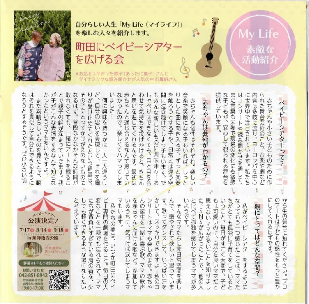 私たちの夢は、この町田市にベイビーシアター専門の劇場を作ることです。ベイビー親子がいつでも通うことができ、アートの体験と情報発信のステーションにもなる場を日本で最初に町田市に作りたいと願いながら活動しています。