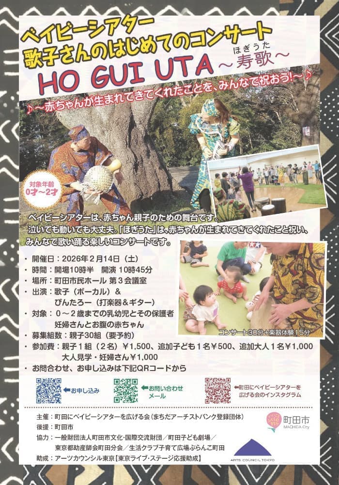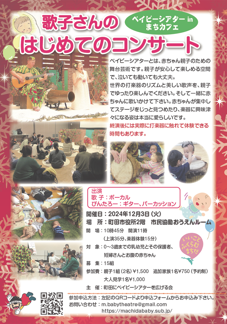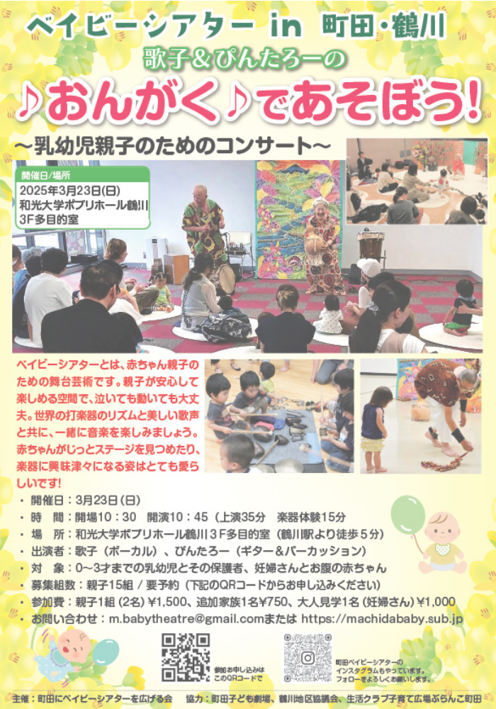 プロのアーチストのパフォーマンスを、赤ちゃんとママ・パパが安心して過ごせる空間で、さらに子育てを相談できる親同士の仲間作りなどを視野においた、充実した時間を過ごせる様に配慮した公演の実施を目指しています。